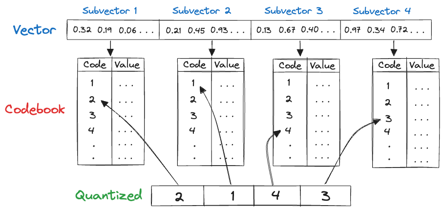 Quantization is a compression technique used to reduce the dimensionality of an embedding to speed up search. Product quantization (PQ) works by dividing a large, high-dimensional vector of size into equally sized subvectors. Each subvector is assigned a “reproduction value” that maps to the nearest centroid of points for that subvector. The reproduction values are then assigned to a codebook using unique IDs, which can be used to reconstruct the original vector.